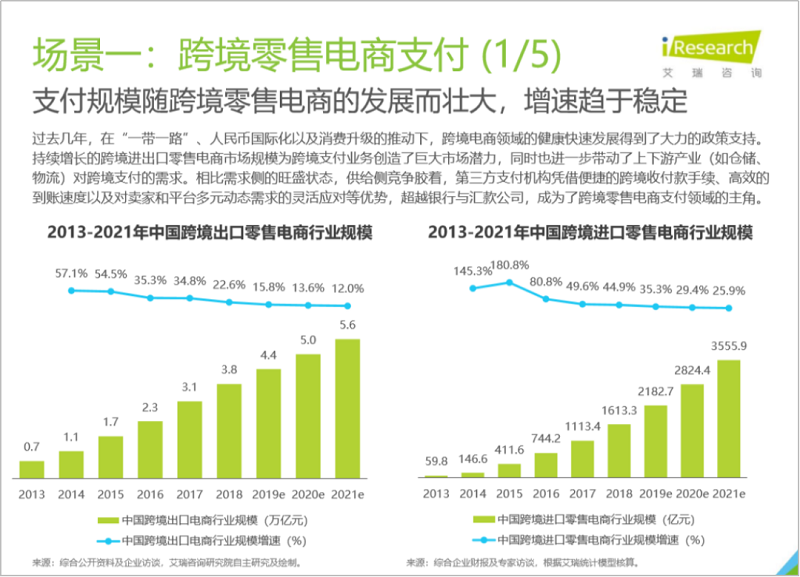过去几年,在“一带一路”、人民币国际化以及消费升级的推动下,跨境电商领域的健康快速发展得到了大力的政策支持。支付规模随跨境零售电商的发展而壮大,增速趋于稳定。