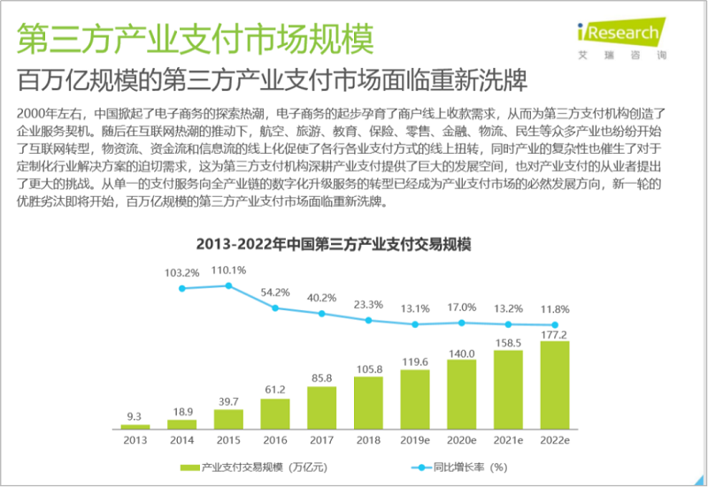 第三方产业支付市场规模,从单一的支付服务向全产业链的数字化升级服务的转型已经成为产业支付市场的必然发展方向,新一轮的优胜劣汰即将开始,百万亿规模的第三方产业支付市场面临新一轮洗牌。